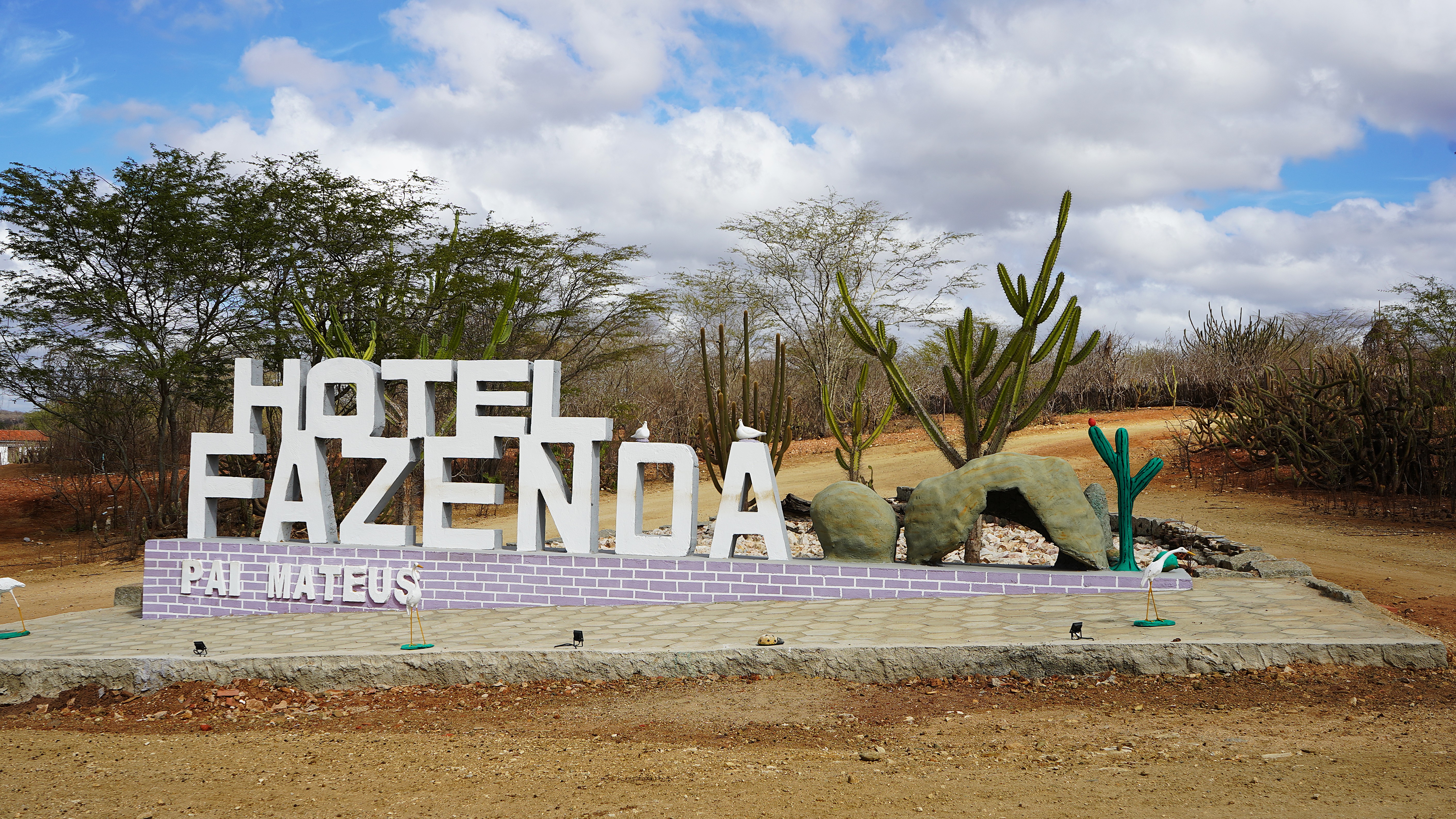 Entrámos em Boa Vista, uma cidade mais ou menos no meio do nada, para comprarmos água, e seguimos pela PB-160. Uns vinte minutos depois estávamos a fazer o desvio para uma estrada de terra batida de 10 kms, que percorremos até o Hotel Fazenda Pai Mateus. A estrada está em bom estado, é perfeitamente transitável, mesmo para um carro relativamente baixo como o nosso, o que não impediu que este ficasse com mais uma camada de pó. Esta estrada já se encontra no interior de uma fazenda particular, e ao percorrê-la passámos por casas dispersas, algumas plantações e vários animais, sobretudo cabras e bois, até nos depararmos com um enorme letreiro anunciando o hotel.