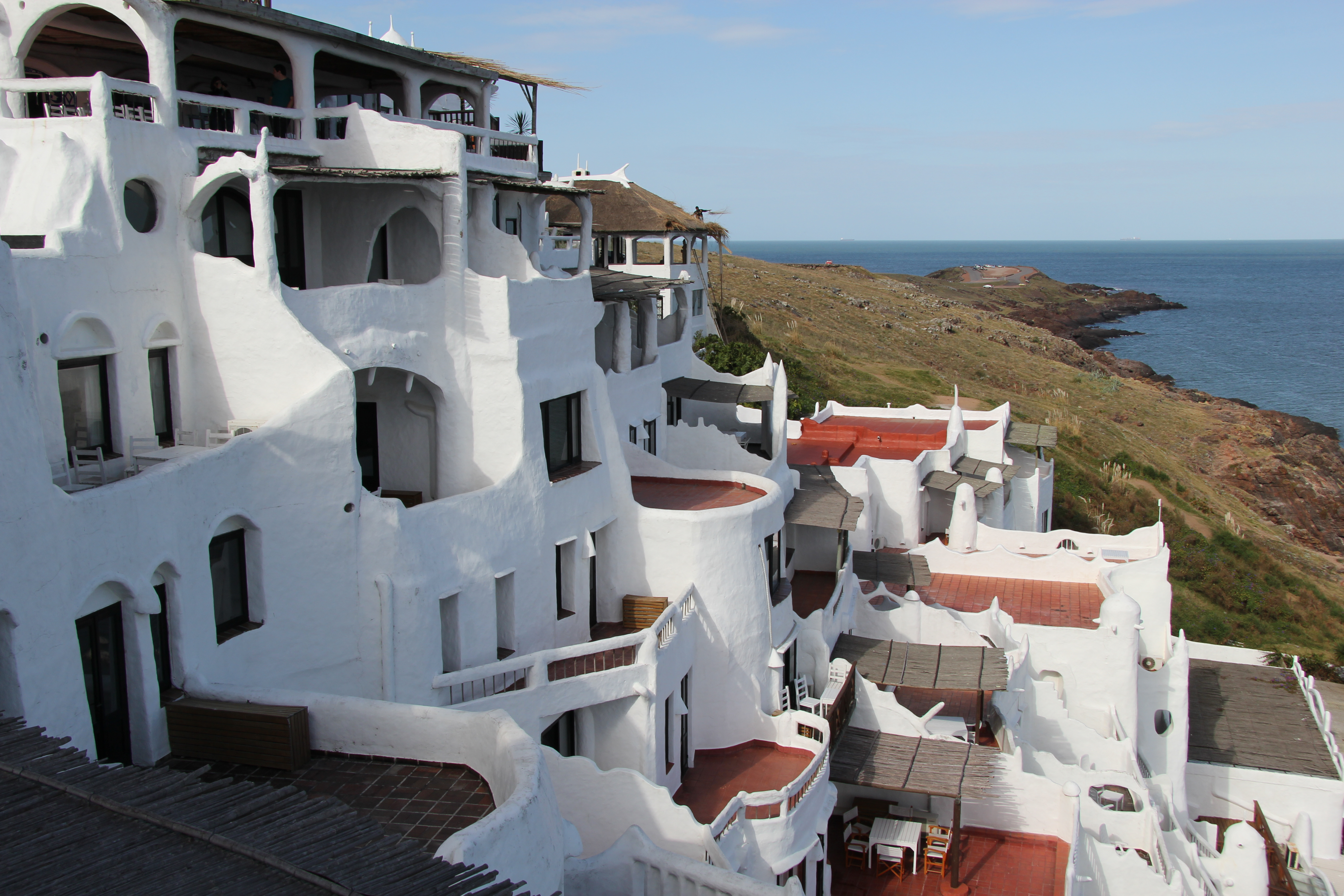Cada terraço, varanda ou ruela tem uma identidade própria, e a alguns deles foram atribuídos nomes, como John Lennon, Mario Benedetti ou Pelé, entre muitos mais, mas, no seu conjunto, Casapueblo é, nas palavras do próprio Páez Vilaró, uma “homenagem ao sol e uma oferenda à mulher”. As cúpulas representam a sua maneira de “escrever contra o céu”. Todo o espaço é branco, puro, imaculado, como não podia deixar de ser e como o autor quis que fosse, desde o início. Belo e impactante, sobretudo em jornadas límpidas, luminosas, como foi o caso do dia da nossa visita, quando aquela harmoniosa massa branca reforça ainda mais o azul profundo do céu, e vice-versa. Existem mais de cinquenta quartos em todo aquele imenso espaço curvo, como o próprio universo, que inclui a residência de Vilaró, o museu e um hotel.